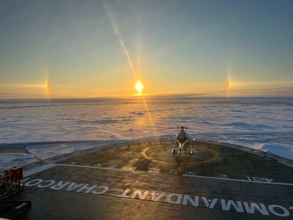 “Upon arriving at the Geographic North Pole, we were treated to an extraordinary surprise, a rare atmospheric phenomenon known as a sundog,” Captain Garcia recounts. “This creates the illusion of three suns connected by a luminous halo.”