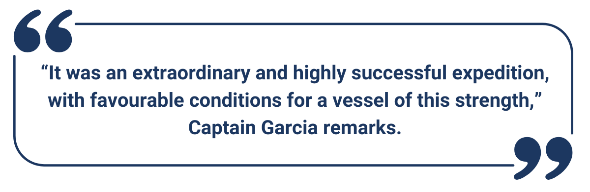 “It was an extraordinary and highly successful expedition, with favourable conditions for a vessel of this strength,” Captain Garcia remarks. “At times, navigating this traverse felt easier than sailing to East Greenland in springtime.”