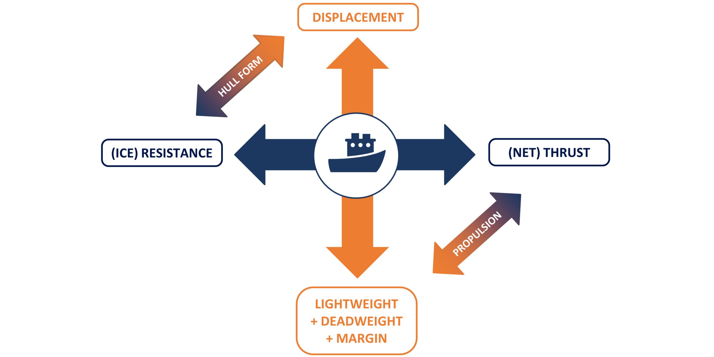 A fundamental design driver of every icebreaker is the weight-performance balance. It consists of two seemingly independent, but actually coupled, force-balance equations: the weight equation in the vertical direction and the performance equation in the horizontal direction. Together, these essentially determine how large and powerful the icebreaker must be to meet its performance goals.