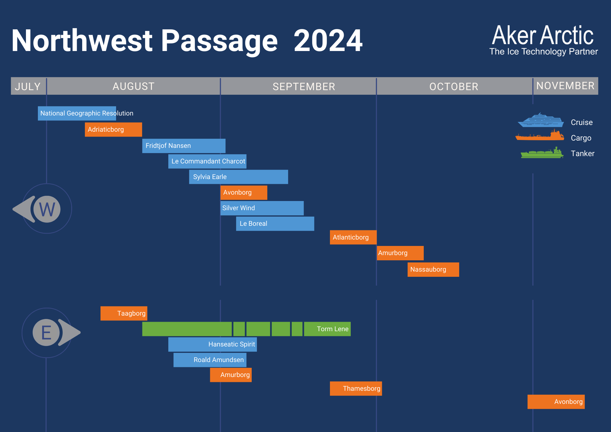 This year a total of 18 ships completed the full journey. Of these, 11 were westbound (six cruise ships and five cargo ships), while seven were eastbound (two cruise ships, four cargo ships, and one tanker). Two cargo ships completed return voyages within the same season, taking advantage of the Arctic shortcut in both directions.