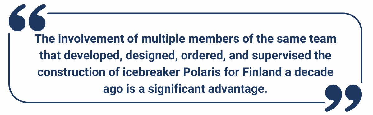 The involvement of multiple members of the same team that developed, designed, ordered, and supervised the construction of icebreaker Polaris for Finland a decade ago is a significant advantage. Understanding the concept development process in general and having experience from developing icebreakers utilising the latest technology facilitates rapid decision-making and adherence to the tight schedule.